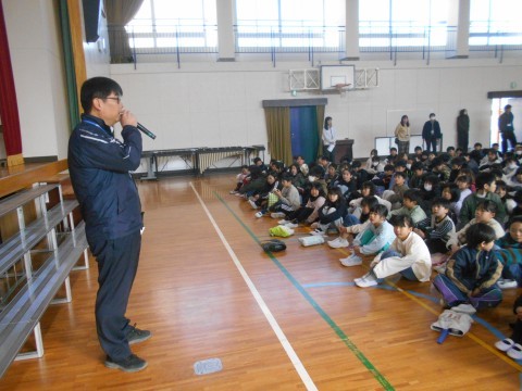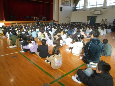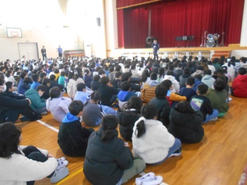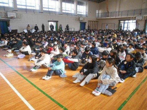 今日の2時間目に不審者対応訓練が行われました。体育館に集まり,校長先生の話を全員で真剣に聴いています。