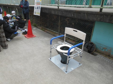 堺市役所の方々に来ていただき,防災学習が行われました。こちらはマンホールトイレについて,教えてもらっています。