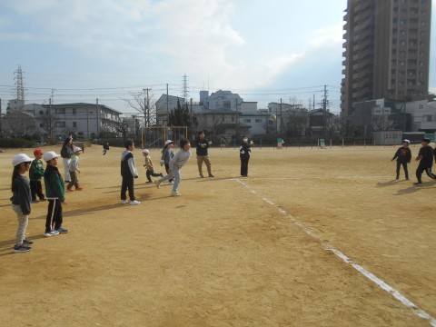 異学年で対戦。上の学年は利き手と反対で投げるルールです。とても盛り上がっていました♪