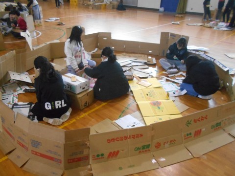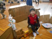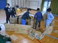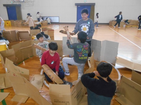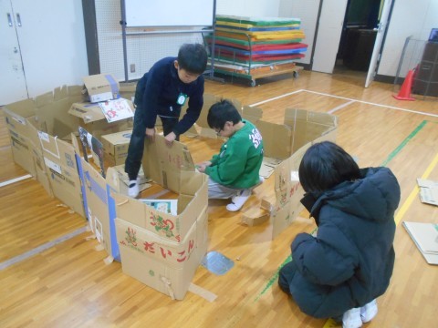 段ボール制作が随分仕上がってきました! 囲いをしているグループが多かったです。カッコイイ♪(囲いだけに…)
