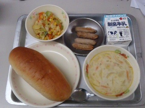 今日の給食は「黒糖パン,牛乳,クマラスープ,焼きウインナー,野菜ソテー」です。