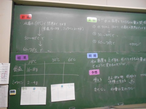 食塩とミョウバンの温度の違いによる溶け方について,実験しているようですね。
