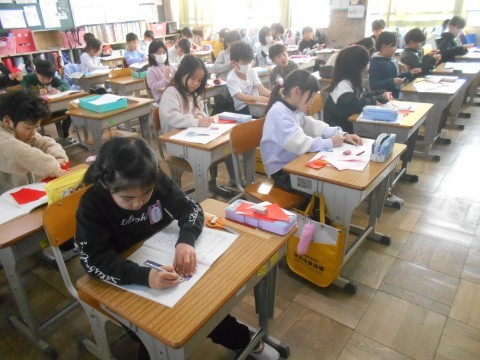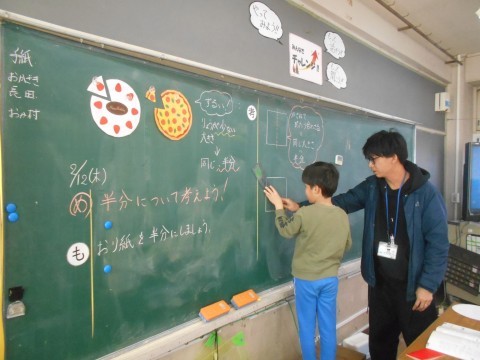 算数の時間です。「半分について考えよう!」折り紙を使って考えていました。