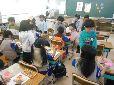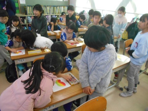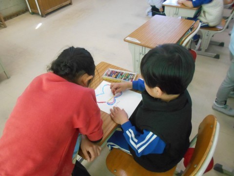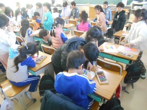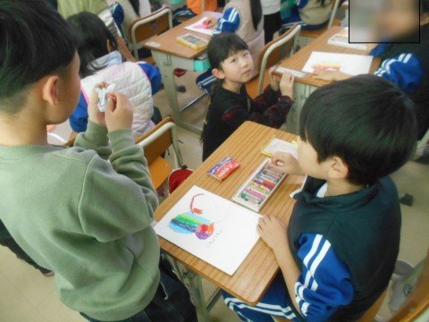 1年生わくわく広場 その7 公開日 2026/02/18 更新日 2026/02/18 1ねんせい クレパスを使った工作。見守ってあげる姿,一緒に塗ってあげる姿,クレパスをティッシュで拭いてあげる姿… めちゃくちゃ素敵です☆彡 +5