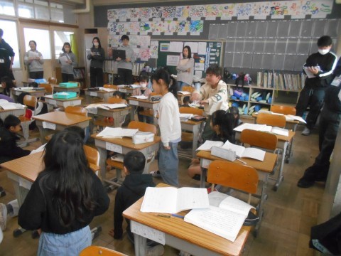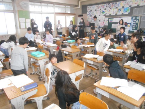 教科書の「おそろしいいきおいではねあがり…」を体で表現しています。教科書の描写に着目して,みんなで理解し合っていました。