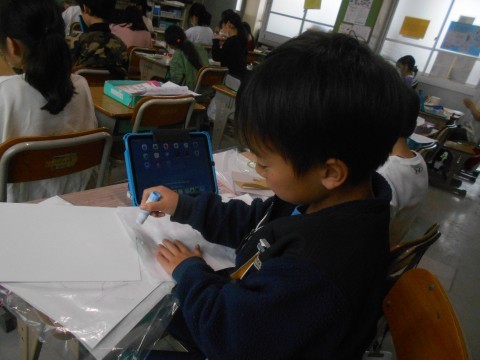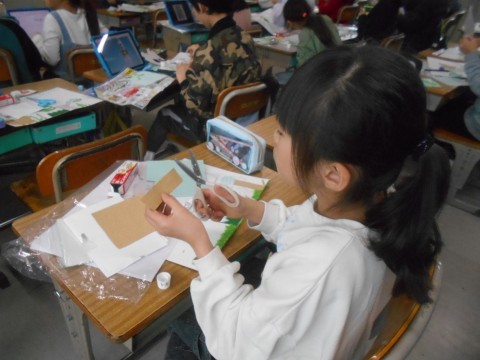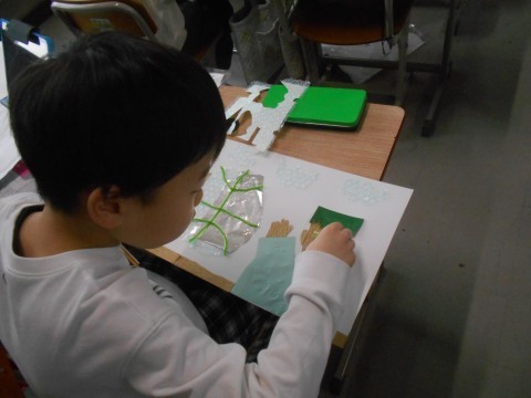 プチプチや色々な素材を切り貼りして,版画のもとを作成中。