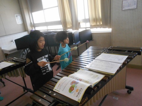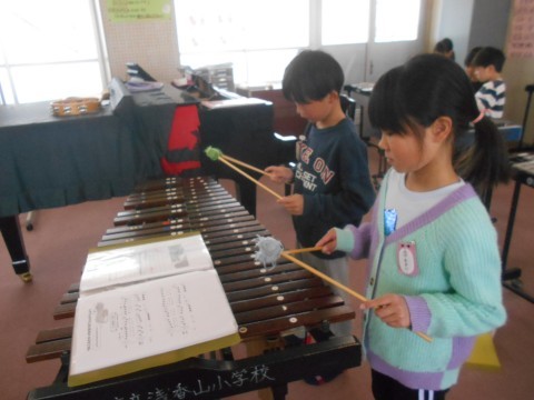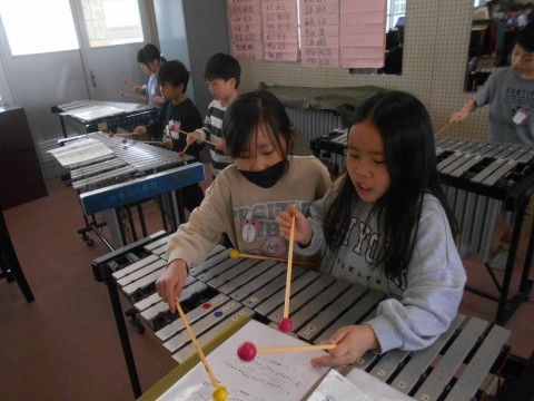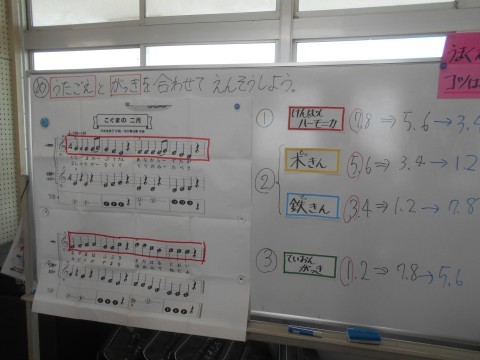 「歌声と楽器を合わせてえんそうしよう」という本時のめあて。ペアやグループで取り組んでいます。