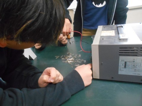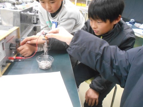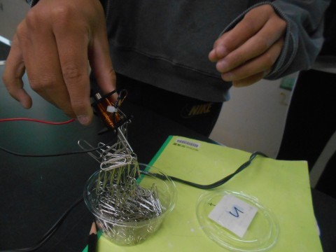 コイルに鉄心を入れた状態で電気を流すと… おぉ~,ゼムクリップが大量にくっつきます!! 楽しいですね♪