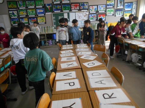 外国語活動の時間です。机の上にアルファベットを並べ,「どんじゃんけんゲーム」!!