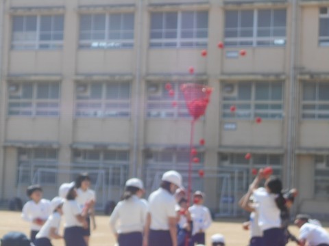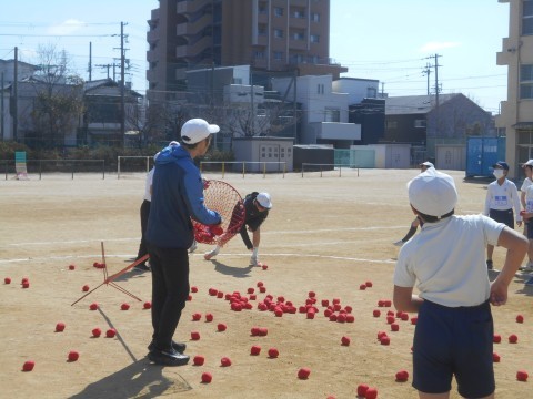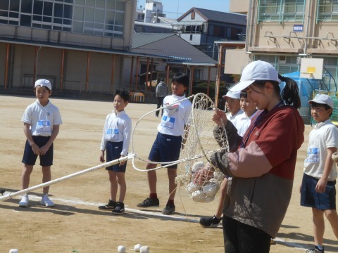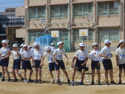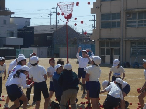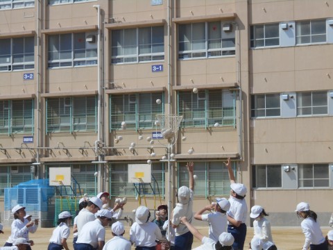 5年生が学年でミニ運動会をしていました! こちらは玉入れです。