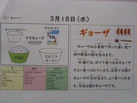 今日の給食は「ごはん,牛乳,豚骨ラーメン,焼きぎょうざ,キャベツのソテー」でした。