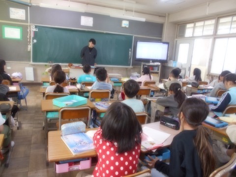 あるものになり切ってお話をつくる学習です。初めに,先生が見本の文章をつくって読んでくれました。先生は車が好きなので,車になり切って作ったようです!