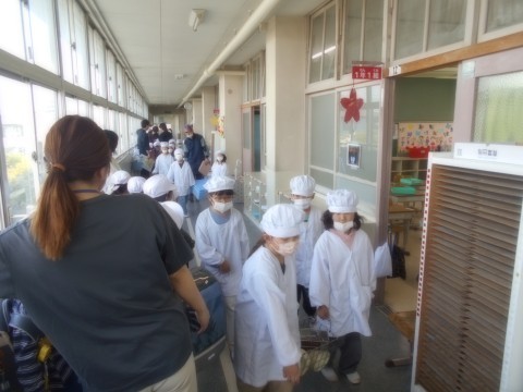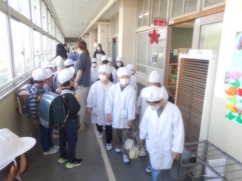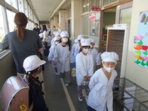 給食当番さんがみんなの給食を運んでくれています。1年生の教室の前を通った時には,「おいしそう!」「明日から給食楽しみ!」という声が聞こえてきました。