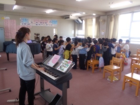 音楽では,貨物列車の音に合わせて,みんなでじゃんけん大会!担任の先生も一緒になってリズムにのって取り組みました。