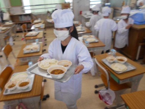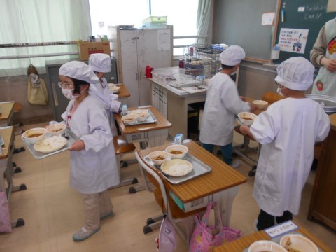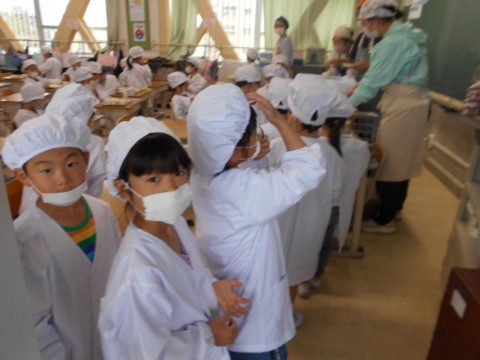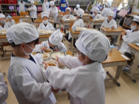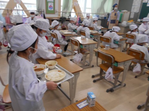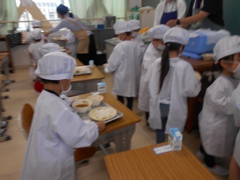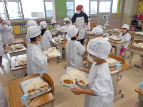 順番に並んで,お盆を持って,献立のおかずたちを載せて,自分の席まで! 慎重に,慎重に歩く姿が初々しいです♪