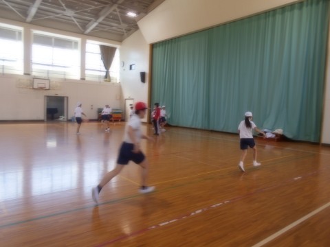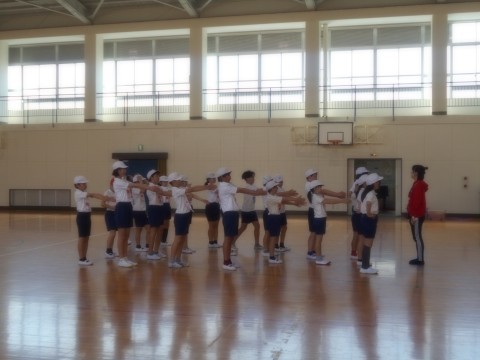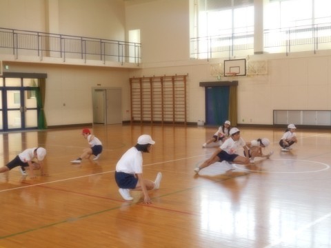 整列をして,まずはウォーミングアップです!今日は,みんなで線おにをして体を温めました。