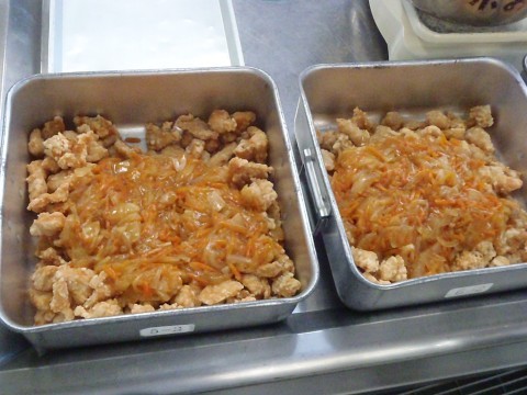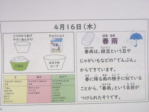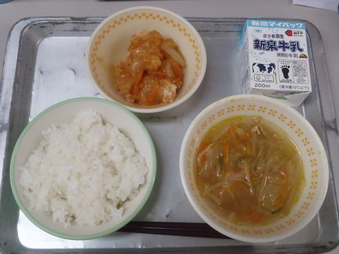 今日の給食は「ごはん,牛乳,春雨スープ,鶏のからあげ野菜あんかけ」です。