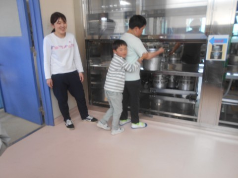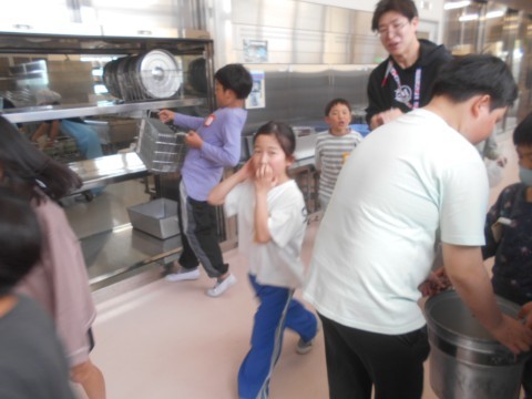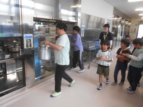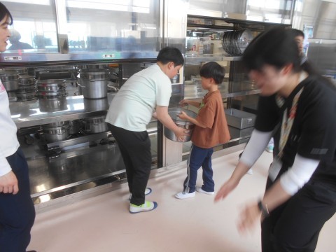 給食委員会の様子です。重いものを持ち上げるのに手伝ってあげます。優しい6年生が大好きと伝わります。