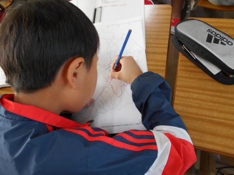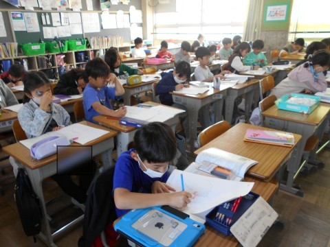 4年生授業の様子 その1 公開日 2026/04/23 更新日 2026/04/23 4年生 社会の時間。白地図の堺市を赤鉛筆で囲み,大阪府の中でどんな場所にあり,いくつの市と隣接してるか等,調べていました。 +3