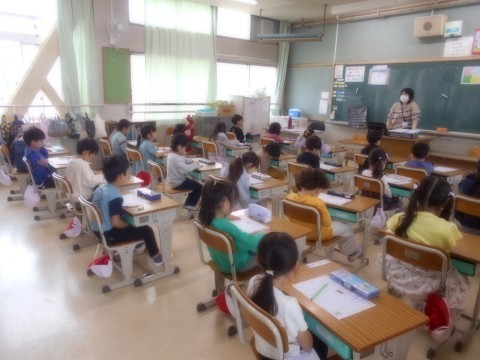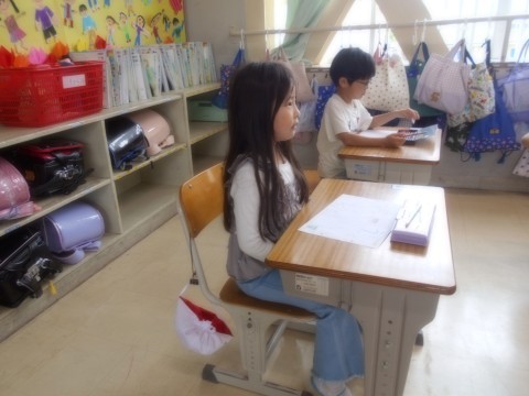 ひらがなの「う」の練習です。先生と一緒に書き順を確認しました。先生の話を聞いている時も,とってもいい姿勢で聞けている子がいました!すばらしい!