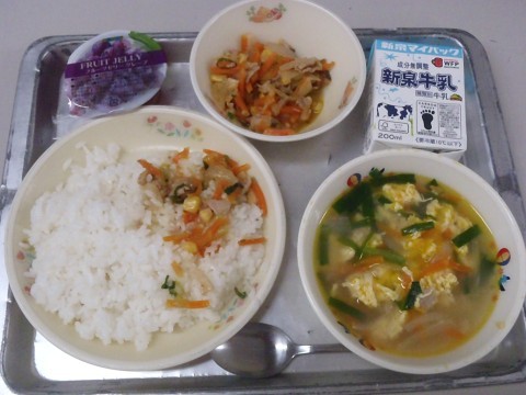 今日の給食は「ごはん 、牛乳,にらたまスープ,まぜたらチャーハン,フルーツゼリー(ぶどう)」です。