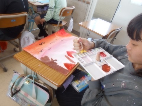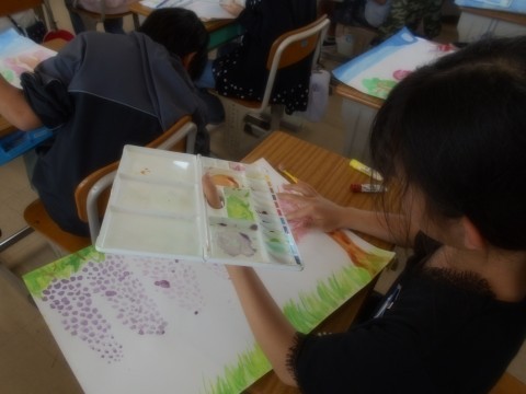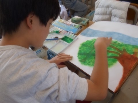 自分の好きな風景を水彩画で描きました。筆だけでなく、スポンジで押し付けたり手でのばしたりと、いろいろな方法で表現しました。