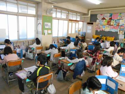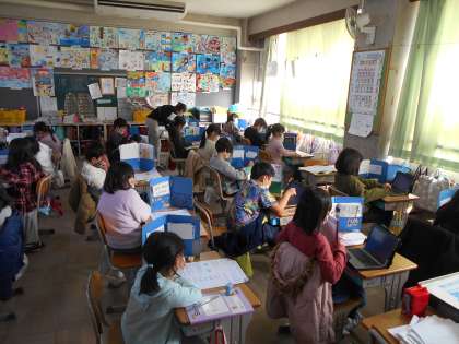 テストが終わった児童は新聞づくりをしていました。