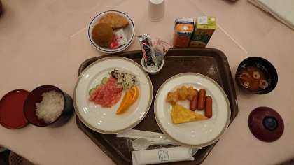 ご飯と味噌汁、パンもある朝食です。美味しそうです。