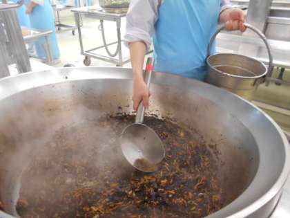 ひじきの洋風煮は,ベーコンと人参・ひじきを油で炒めてから,中華風の出汁で煮ます。