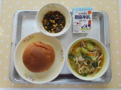 献立は「ミルクパン,牛乳,しょうゆラーメン,ひじきの洋風煮」でした。