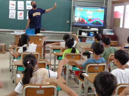 初めてNSの先生による英語がありました。一生懸命先生の発音を聞きながら,乗り物の単語を繰り返し練習をしたり,歌に合わせて動きと一緒に発音をしたりました。