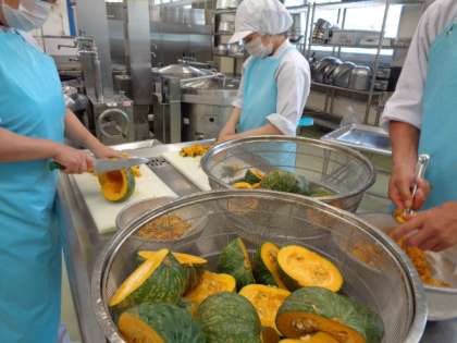 裏ごしかぼちゃと角切りかぼちゃを入れて,コクと食感を楽しみました。