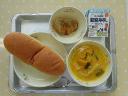 献立は「コッペパン,牛乳,パンプキンスープ,あじフライ」でした。