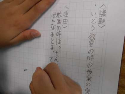 話し合いの進め方について学んだことを活かし,身の回りの問題について話し合うための準備をしていました。