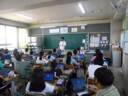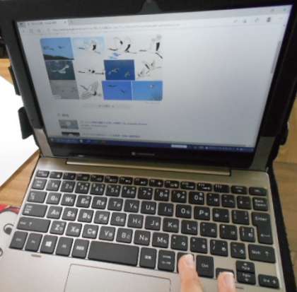 鶴の絵を描くために,タブレットで鶴の姿を見ています。