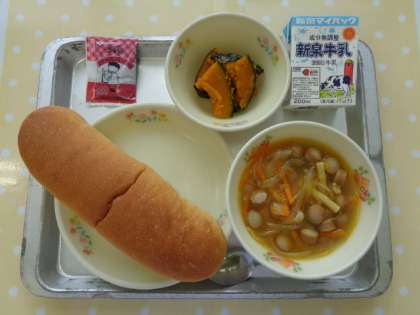献立は「コッペパン,牛乳,オニオンスープ,ベイクドパンプキン,チョコだいずクリーム」でした。