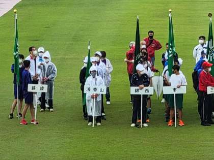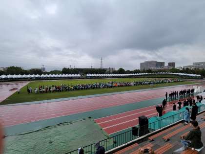 小雨の降る中、金岡公園陸上競技場にて開催されました。開会式です。