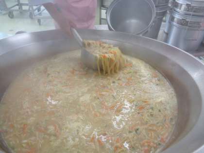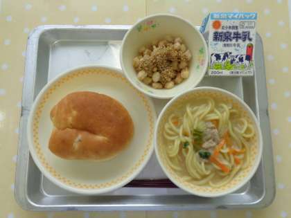献立は「おさつパン,牛乳,ちゃんぽん麺,大豆のごまがらめ」でした。