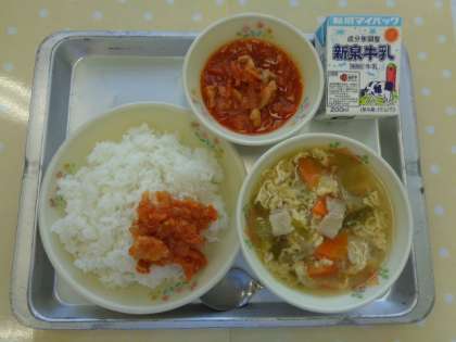 献立は「ご飯,牛乳,レタスと卵のスープ,セルフチキンライス」でした。