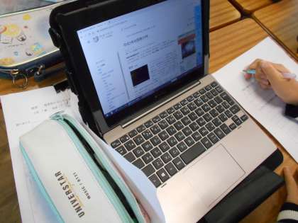 タブレットを使って防災について調べていました。