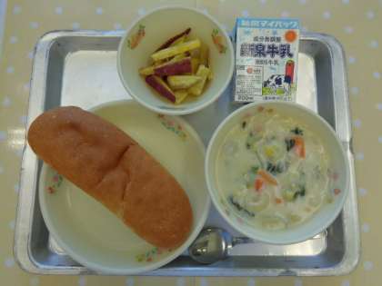 献立は「コッペパン,牛乳,白菜とチンゲン菜のクリーム煮,さつまスティック」でした。