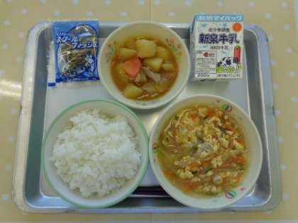 献立は「ご飯,牛乳,四川風スープ,中華風肉じゃが,ミニフィッシュ」でした。