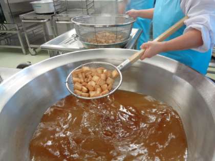厚揚げは,大きな釜で油抜きをしてから煮込んでつくりました。