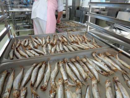 「頭から食べる?それともしっぽから食べようかな?」ししゃもは丸ごと食べることができるカルシウムたっぷりの魚です。