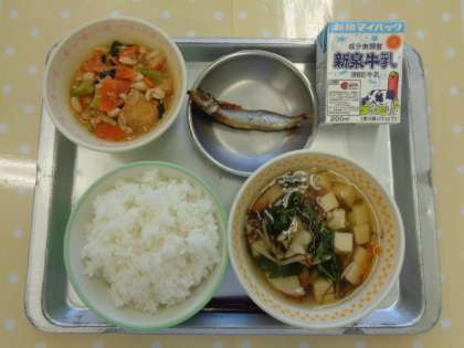 献立は「ご飯,牛乳,もずく汁,焼ししゃも,大豆と厚揚げのピリ辛炒め」でした。