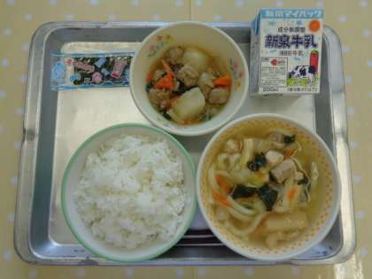 献立は「ご飯,牛乳,かやくうどん,かぶと肉団子のあんかけ,味付け海苔」でした。