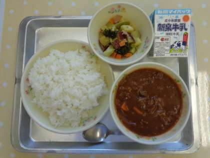 献立は「ご飯,牛乳,ハヤシライス,コロコロサラダ」でした。