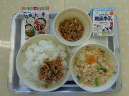 献立は「ご飯、牛乳、むらくも汁、あなご寿司、ひなあられ」でした。