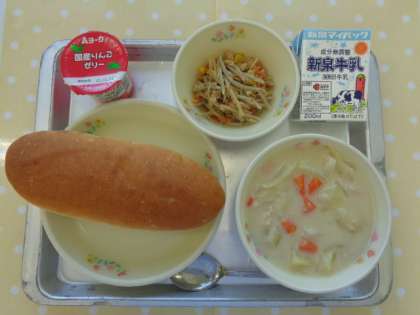 献立は「コッペパン、牛乳、クリームシチュー、ごぼうサラダ、フルーツゼリー」でした。