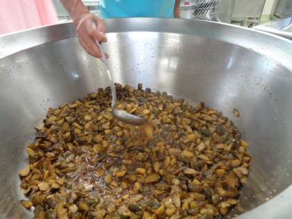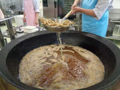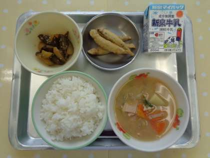 献立は「ご飯、豚汁、きびなごフライ、きゅうりの甘酢煮」でした。